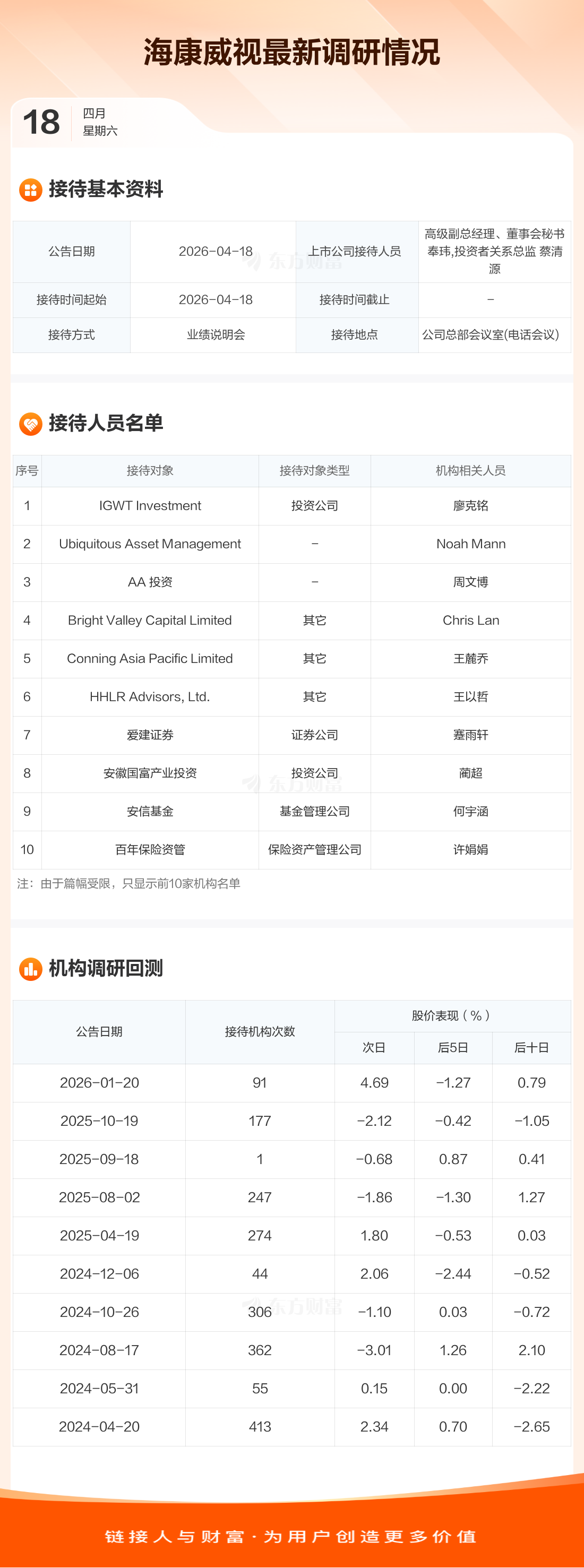 海康威视4月18日公告称,4月18日接待IGWT Investment等194家机构调研。接待人员包括高级副总经理、董事会秘书 奉玮,投资者关系总监 蔡清源。
