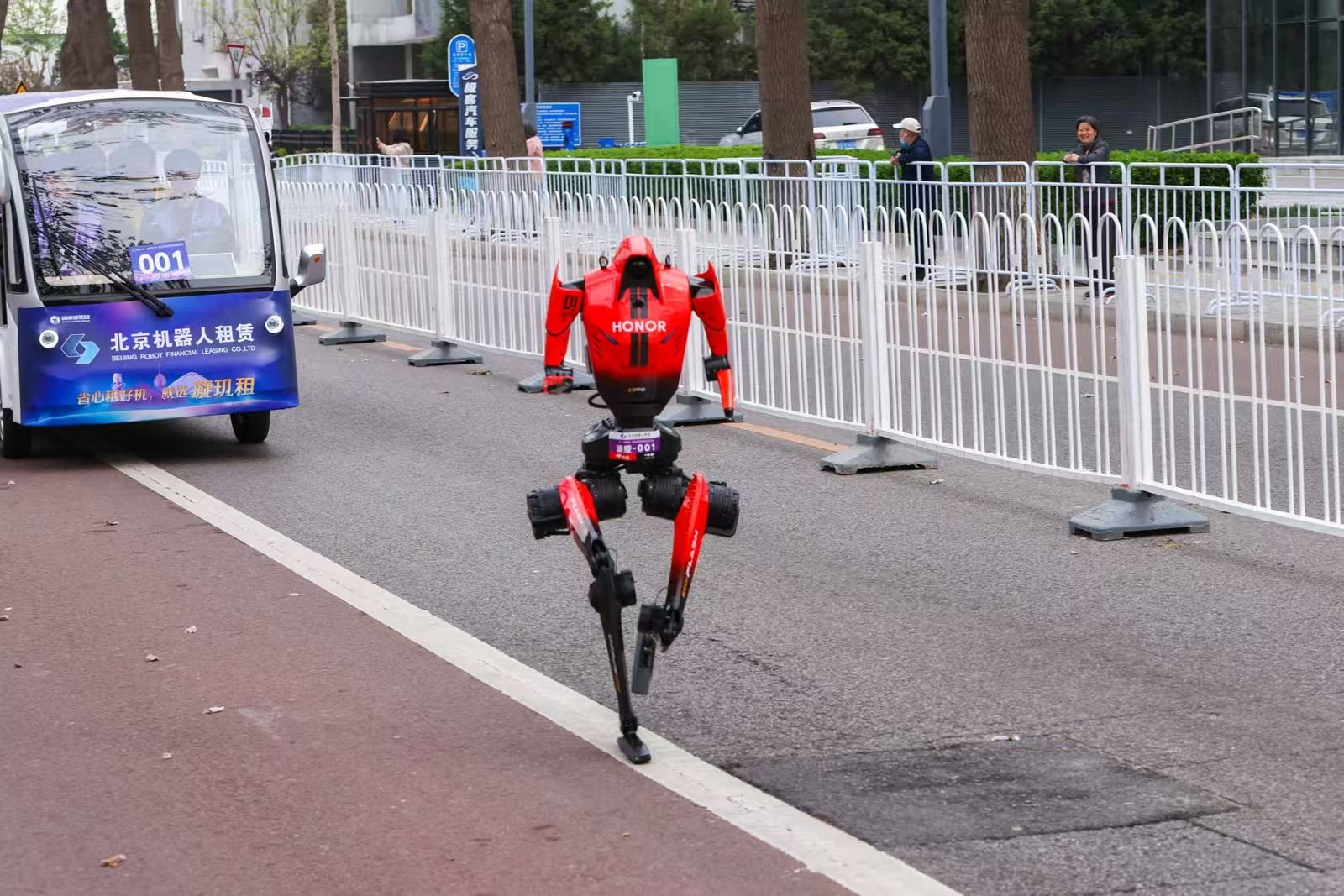 当发令枪响,一个身披红黑机甲、身高169cm的身影率先冲出,它就是荣耀首款人形机器人"闪电"。
