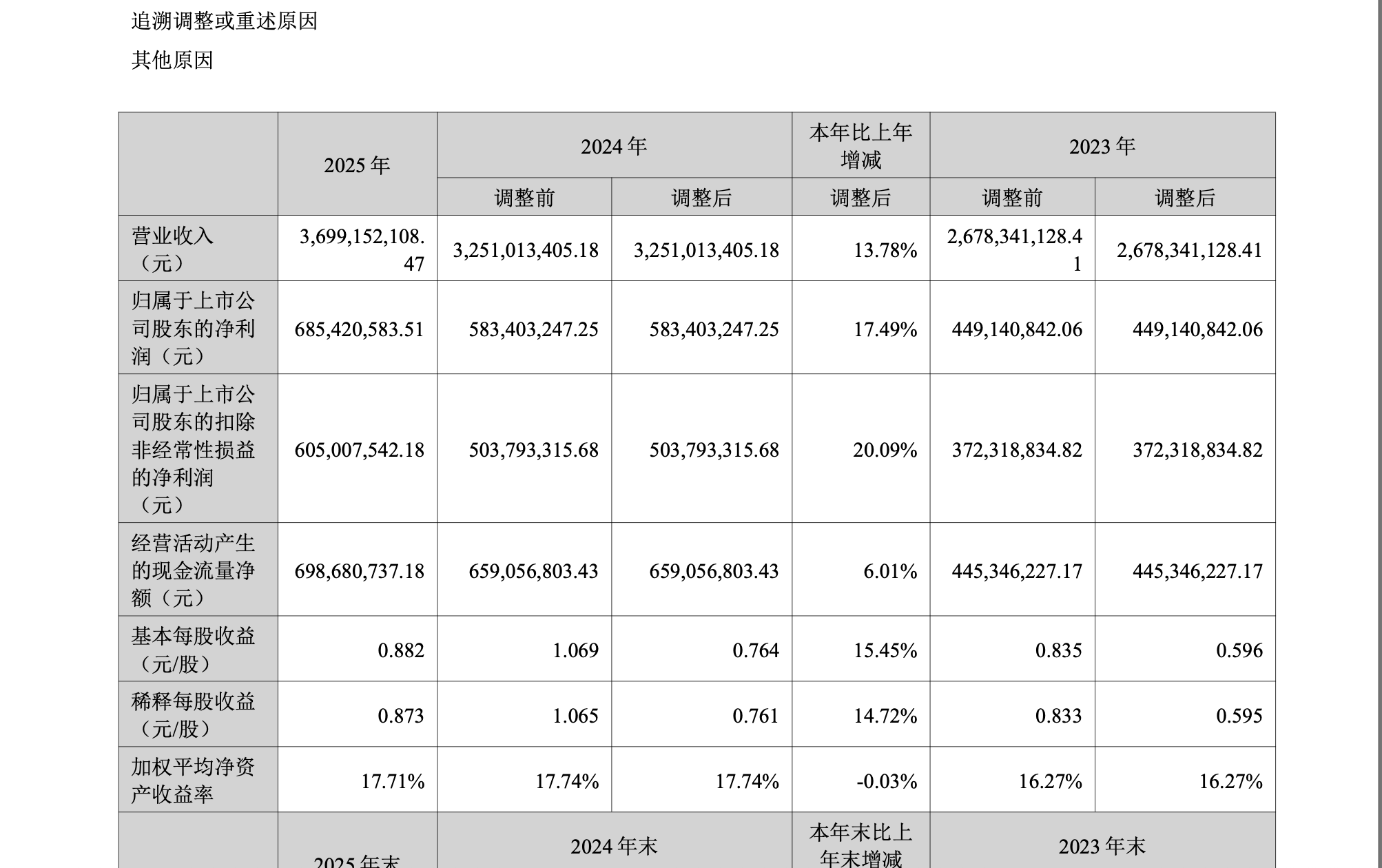 据华测导航近期披露2025年年度报告及业绩相关数据,公司2025年实现营业总收入约36.99亿元,同比增长13.78%;归母净利润6.85亿元,同比增长17.49%,扣非归母净利润6.05亿元,同比增长20.09%,核心盈利指标均实现双位数增长。