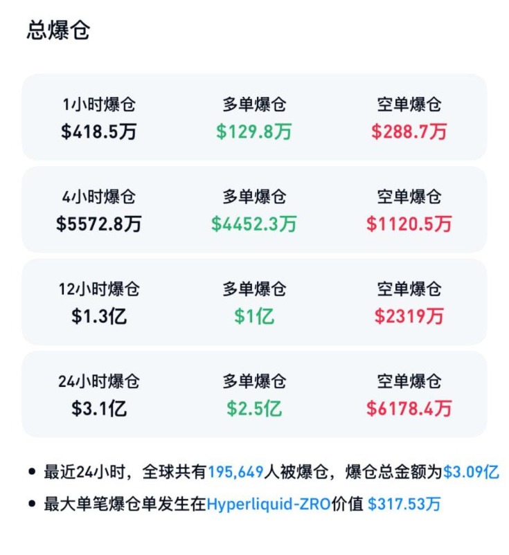 CoinGlass数据显示,最近24小时内,加密货币市场超19万人被爆仓,爆仓总金额为3.09亿美元。其中,多单爆仓金额为2.5亿美元,空单爆仓金额为6178.4万美元。