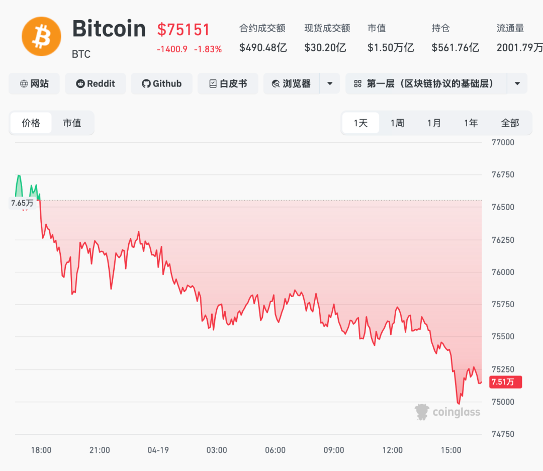 4月19日,比特币一路震荡下跌,一度跌破75000美元关口,截至发稿,报75151美元/枚,跌幅超1.8%。