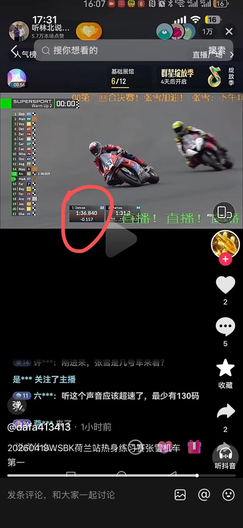 在4月19日的荷兰站第二回合热身赛中,张雪机车53号车手取得第一名成绩。直播截图