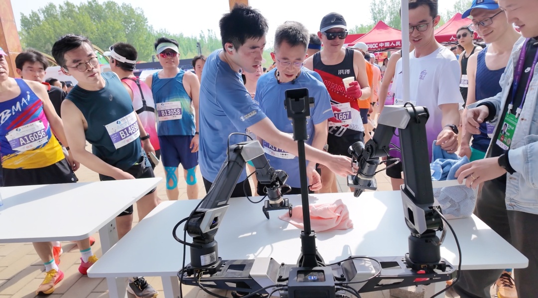 与工业场景中高度结构化的环境不同,马拉松赛道人流密集、环境多变,对机器人的感知、决策与控制能力提出了更高要求。星海图依托VLA大模型的泛化能力,实现了真正的“开箱即用”——无需场景适配即可部署于户外赛道,机器人在户外补给点位全程无遥控、全自主完成叠毛巾、递毛巾、递水等全流程服务动作,运行流畅、响应及时,实现了对跑者动态需求的即时响应与递补,凭借智能交互能力结合赛事场景实现正向引导,进一步提升赛事服务效率与选手体验。不少跑者反馈,机器人补给动作精准、服务贴心,兼具科技感与实用性,为赛事增添了独特体验。