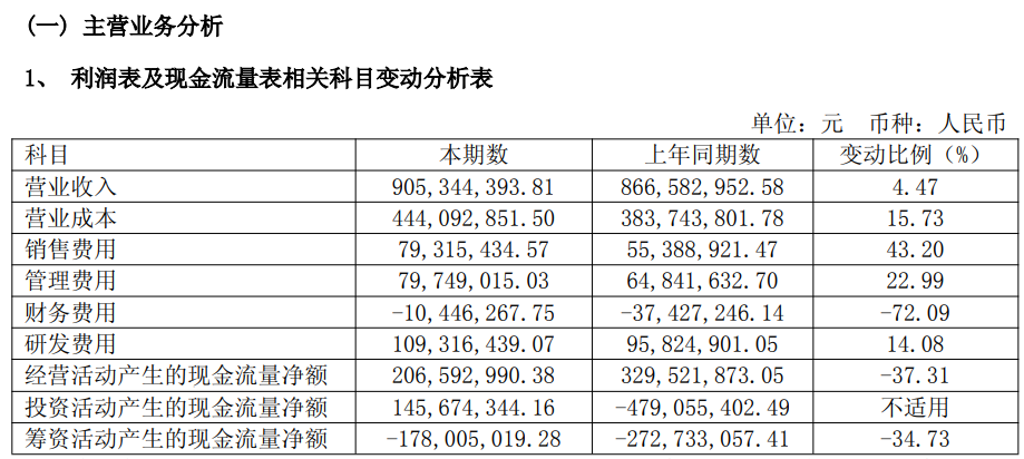 费用方面,销售费用较上年同期增加43.20%,主要系报告期内市场及服务费以及职工薪酬和股权激励费用比去年同期增加所致;管理费用较上年同期增加23%,主要系报告期内新建厂房转固后的折旧摊销增加以及质量体系费用增加所致;研发费用较上年同期增加14.08%,主要系报告期内研发新项目和新产品的测试费增加所致。