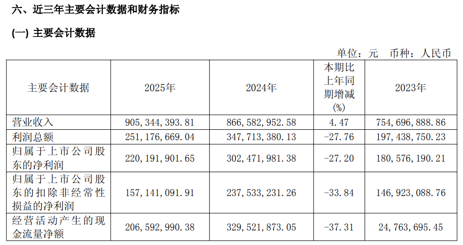 奥泰生物2025年年报显示,公司营业收入为9.05亿元,同比上升4.47%;归母净利润为2.2亿元,同比下降27.20%;扣非归母净利润为1.57亿元,同比下降33.84%;经营现金流净额为2.066亿元,同比下降37.31%;公司拟每10股派发现金红利10元(含税)。