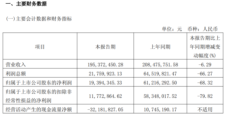 奥泰生物2026年一季报显示,公司2026年一季度实现营业收入1.95亿元,同比下降6.29%;归母净利润1939.43万元,同比下降68.32%。