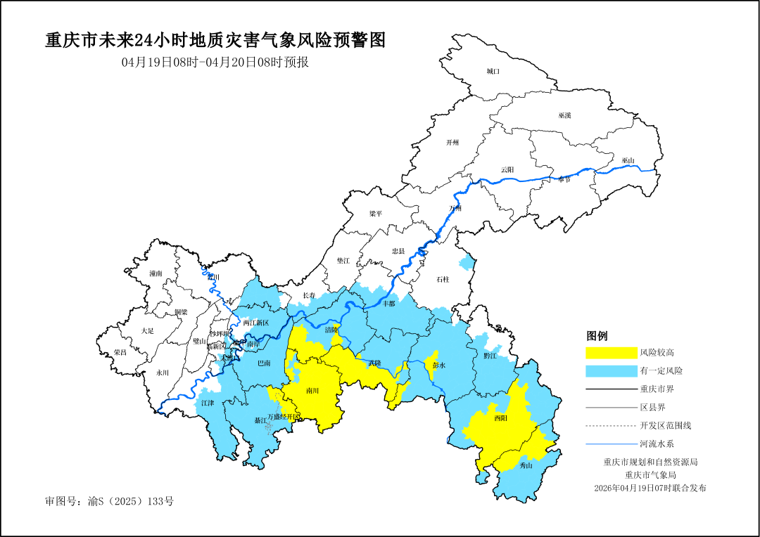 此外,经综合研判,重庆市规划和自然资源局决定于2026年4月19日12时针对沙坪坝区、渝中区、九龙坡区、巴南区、南岸区、大渡口区、两江新区、北碚区、西部科学城重庆高新区、江津区、长寿区、綦江区、万盛经开区、南川区、涪陵区、武隆区、丰都县、石柱县、黔江区、彭水县、酉阳县、秀山县,启动地质灾害四级防御响应。