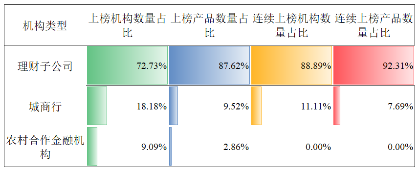 3月榜单的产品留存率均显著下降,仅9家机构的13只产品连续上榜,产品留存率为12.38%。动荡市场凸显固收类产品低风险低波动优势,纯债固收类榜单产品留存率显著高于“固收+”类与混合类。