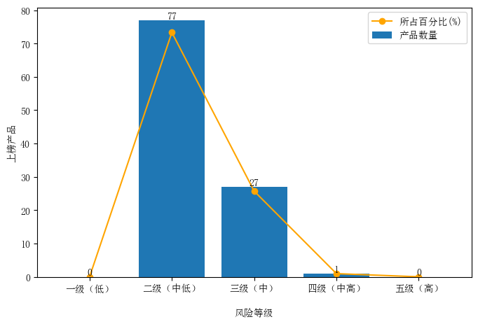 3月榜单整体风险水平向中低风险收敛。一方面,“同类不同级”现象较2月有所减弱,上榜纯债固收类产品风险水平均为二级(中低)风险。另一方面,“同级不同类”的现象仍然突出:“固收+”类上榜产品中,风险等级为二级(中低)风险的比例高达93.33%;上榜的混合类产品中,二级(中低)风险产品数量甚至超过四级(中高)风险产品数量。