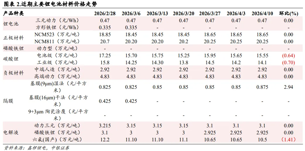 新能源汽车方面,一季度销量虽同比下滑,但随着需求旺季来临,我们依然看好2026年全球新能源汽车销量有望保持较快增长,带动电池和材料需求增长。动力电池方面,锂电旺季来临,有望推动企业订单签订和盈利修复。