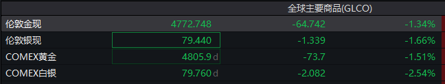 贵金属走低,截至发稿,伦敦金现报4772.75美元/盎司,跌幅1.34%;伦敦银现报79.44美元/盎司,跌幅1.66%。此外,COMEX黄金跌1.51%,COMEX白银跌2.54%。