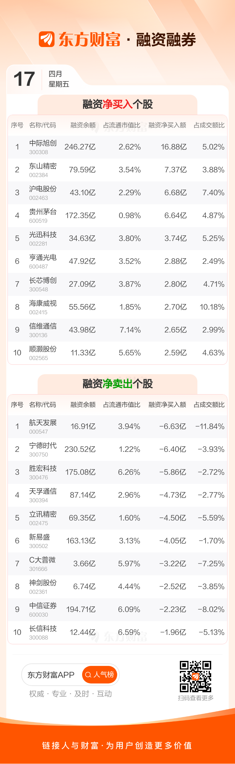 中际旭创为当日融资净买入最多个股,为16.88亿,东山精密融资净买入7.37亿,沪电股份6.68亿。
