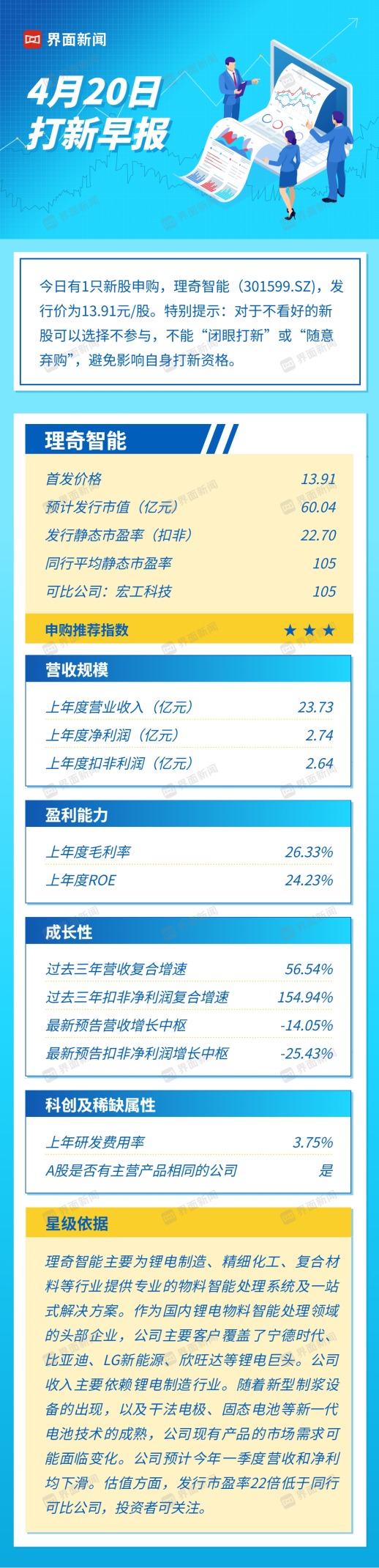 今日有1只新股申购,理奇智能(301599.SZ),发行价为13.91元/股。特别提示:对于不看好的新股可以选择不参与,不能“闭眼打新”或“随意弃购”,避免影响自身打新资格。