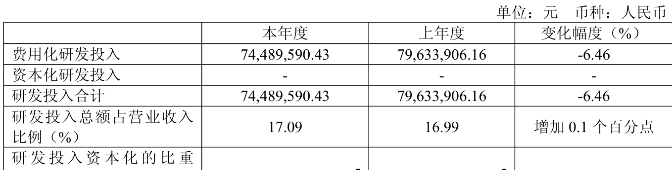 2025年全年,公司研发投入金额为7448.96万元,同比下降6.46%;研发投入占营业收入比例为17.09%,相比上年同期上升0.1个百分点。