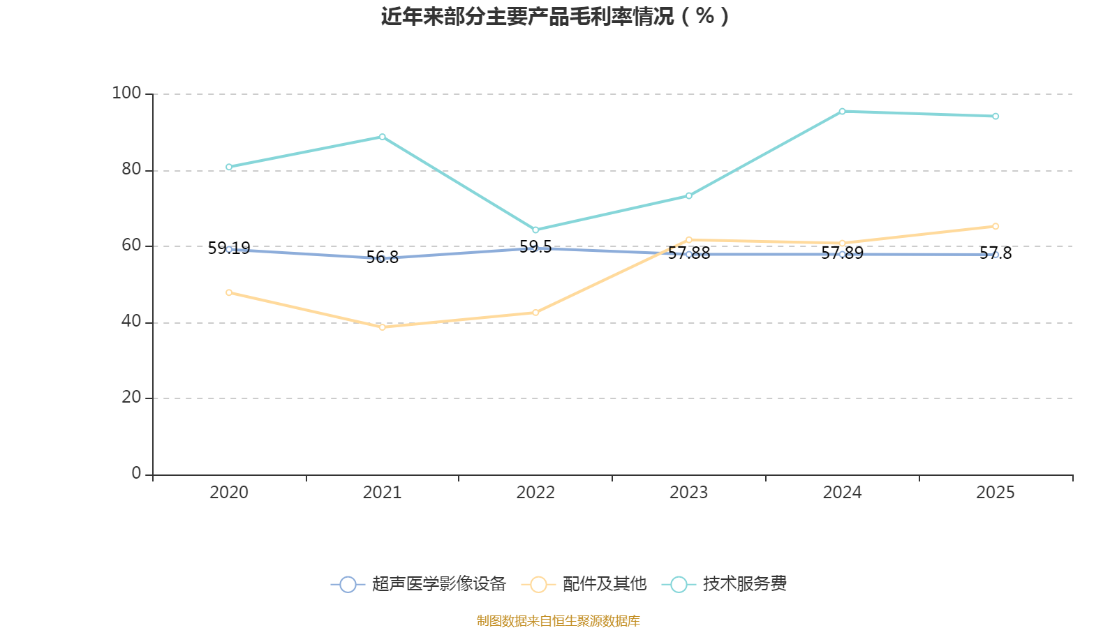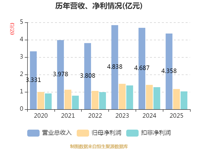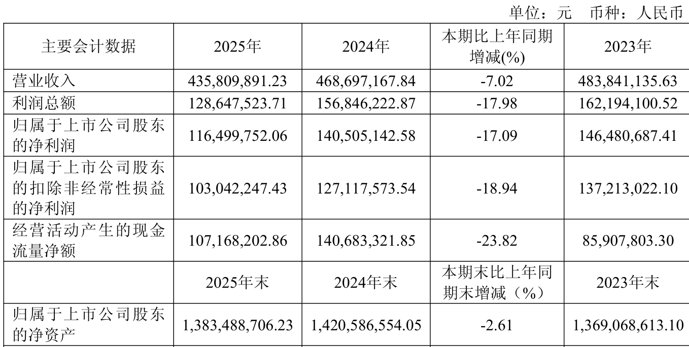 中证智能财讯祥生医疗(688358)4月20日披露2025年年度报告。2025年,公司实现营业总收入4.36亿元,同比下降7.02%;归母净利润1.16亿元,同比下降17.09%;扣非净利润1.03亿元,同比下降18.94%;经营活动产生的现金流量净额为1.07亿元,同比下降23.82%;报告期内,祥生医疗基本每股收益为1.04元,加权平均净资产收益率为8.29%。公司2025年度分配预案为:拟向全体股东每10股派现5.8元(含税)。