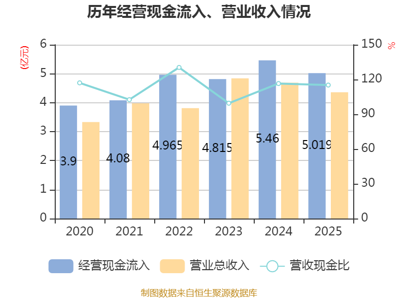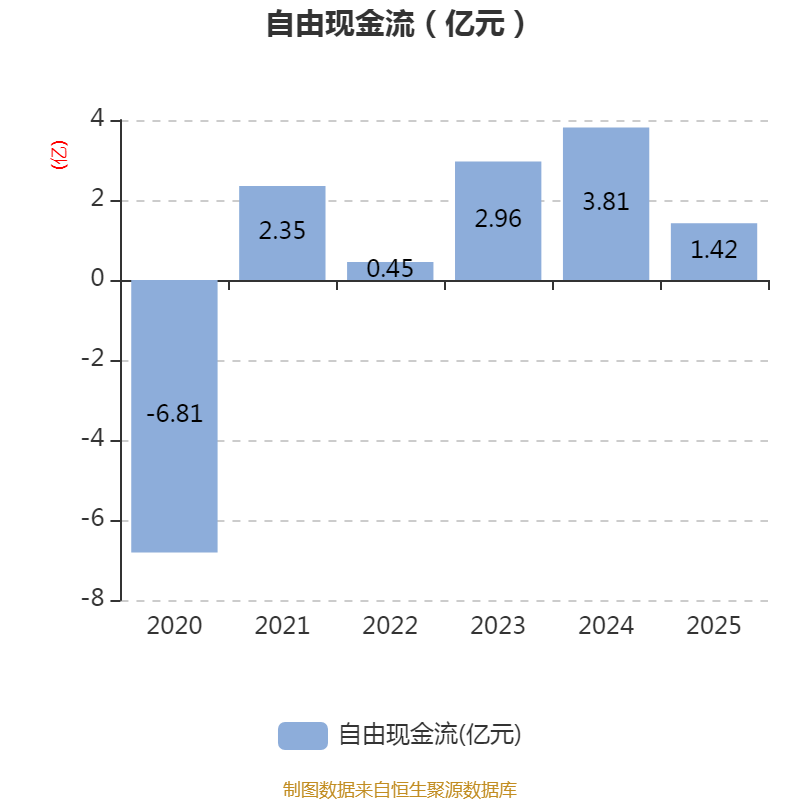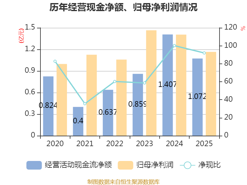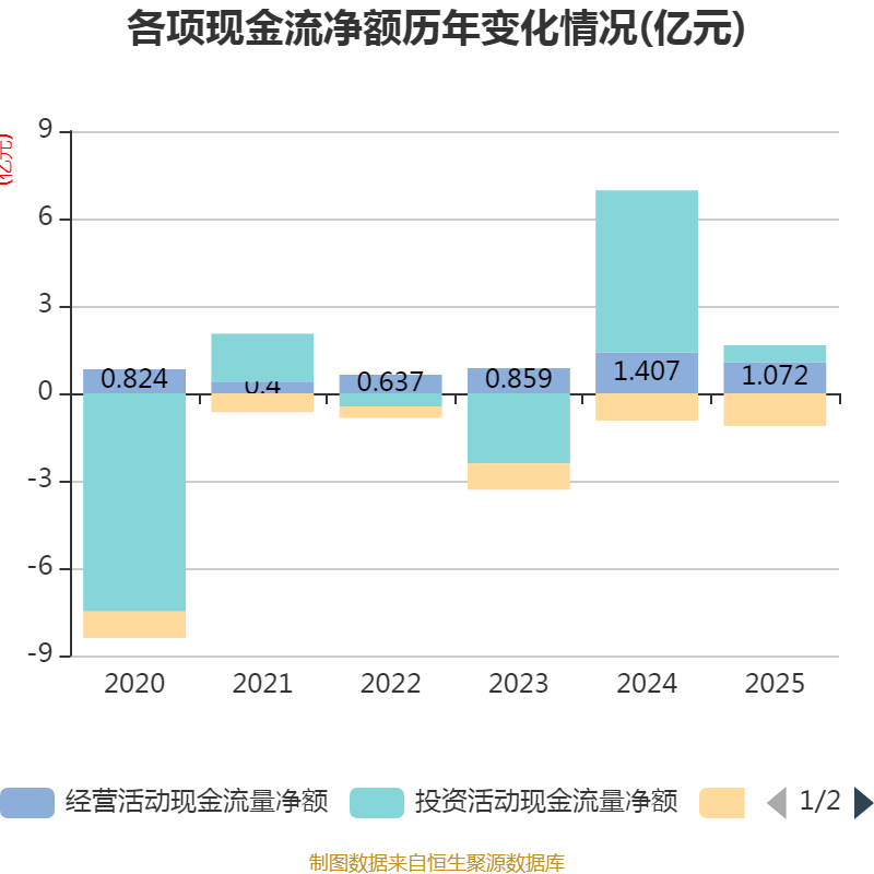 截至2025年,公司经营活动现金流净额为1.07亿元,同比下降23.82%;筹资活动现金流净额-1.13亿元,同比减少1873.57万元;投资活动现金流净额5782.34万元,上年同期为5.56亿元。