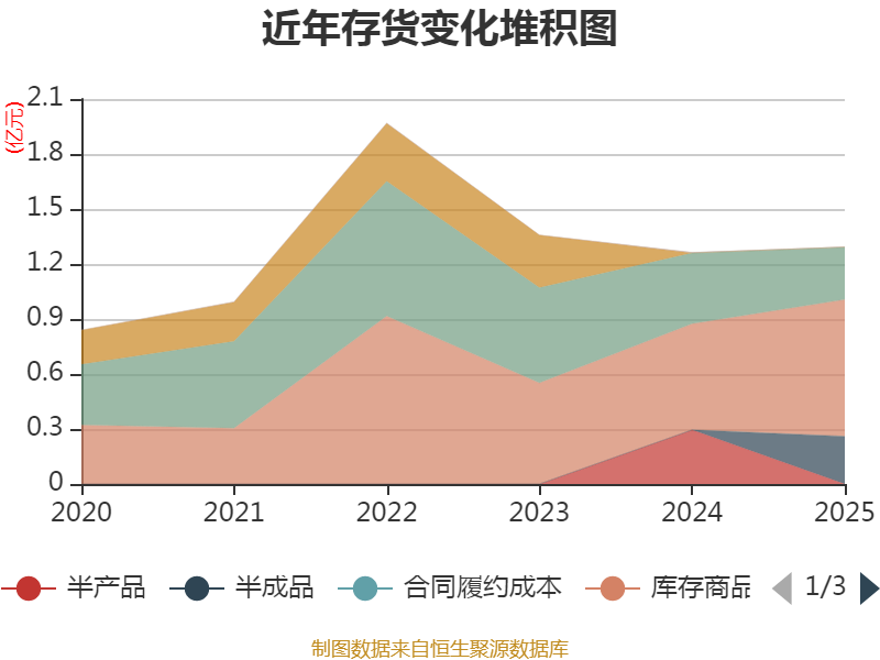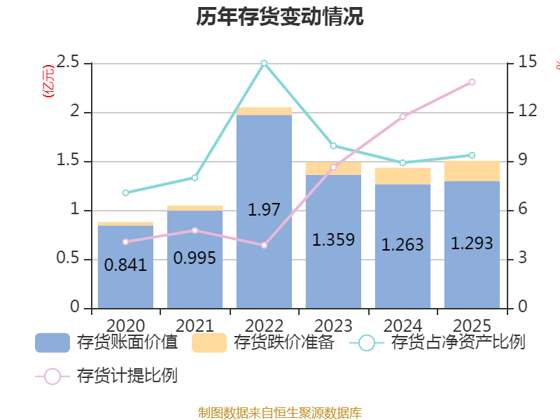 从存货变动来看,截至2025年末,公司存货账面价值为1.29亿元,占净资产的9.35%,较上年末增加301.7万元。其中,存货跌价准备为2077.36万元,计提比例为13.84%。