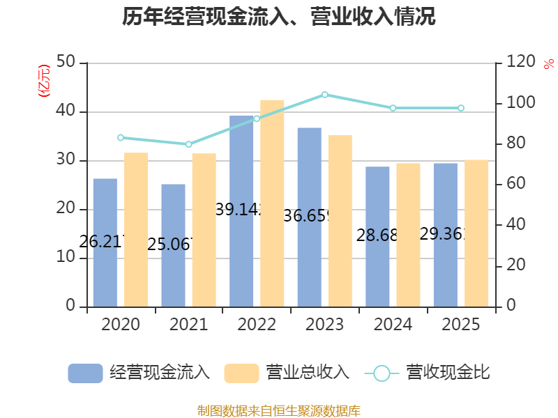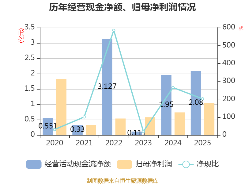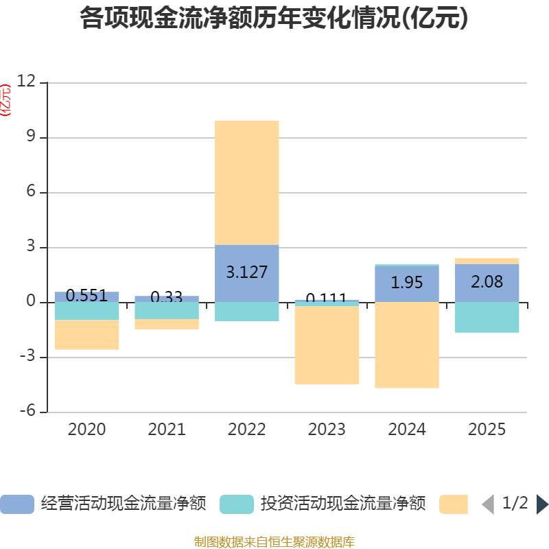 截至2025年,公司经营活动现金流净额为2.08亿元,同比增长6.65%;筹资活动现金流净额3115.41万元,同比增加5.02亿元;投资活动现金流净额-1.68亿元,上年同期为1007.12万元。