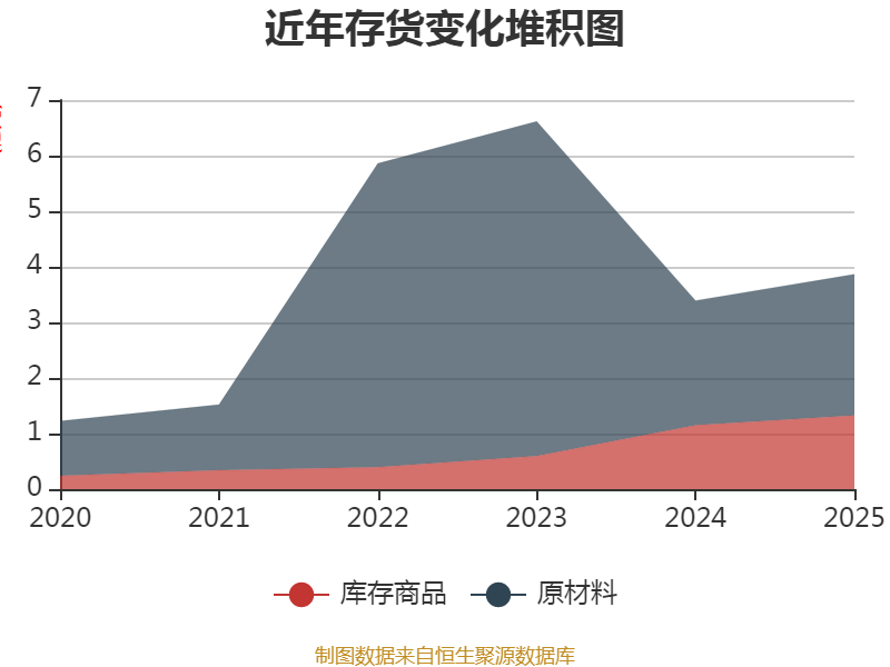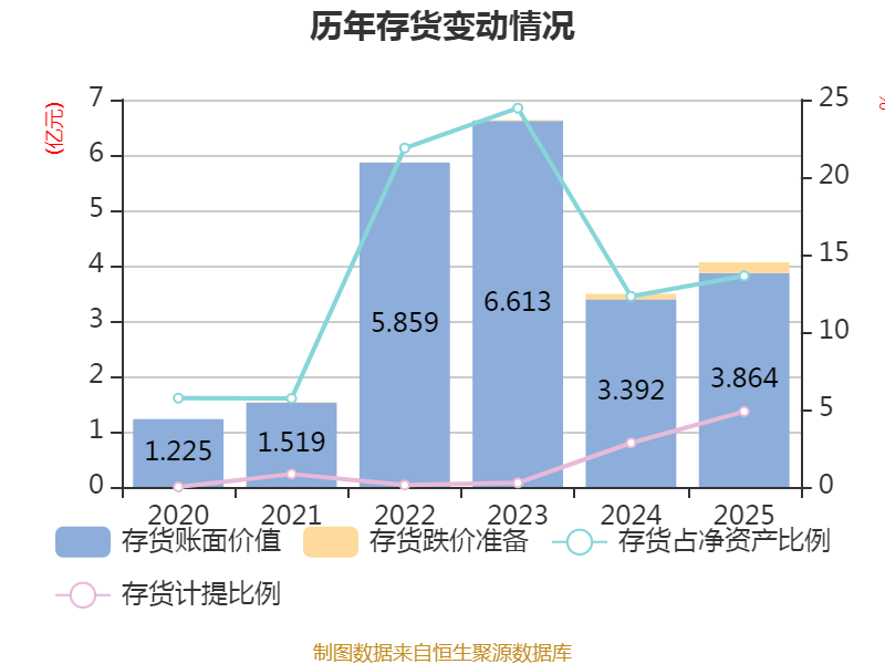 从存货变动来看,截至2025年末,公司存货账面价值为3.86亿元,占净资产的13.62%,较上年末增加4728.36万元。其中,存货跌价准备为1977.15万元,计提比例为4.87%。