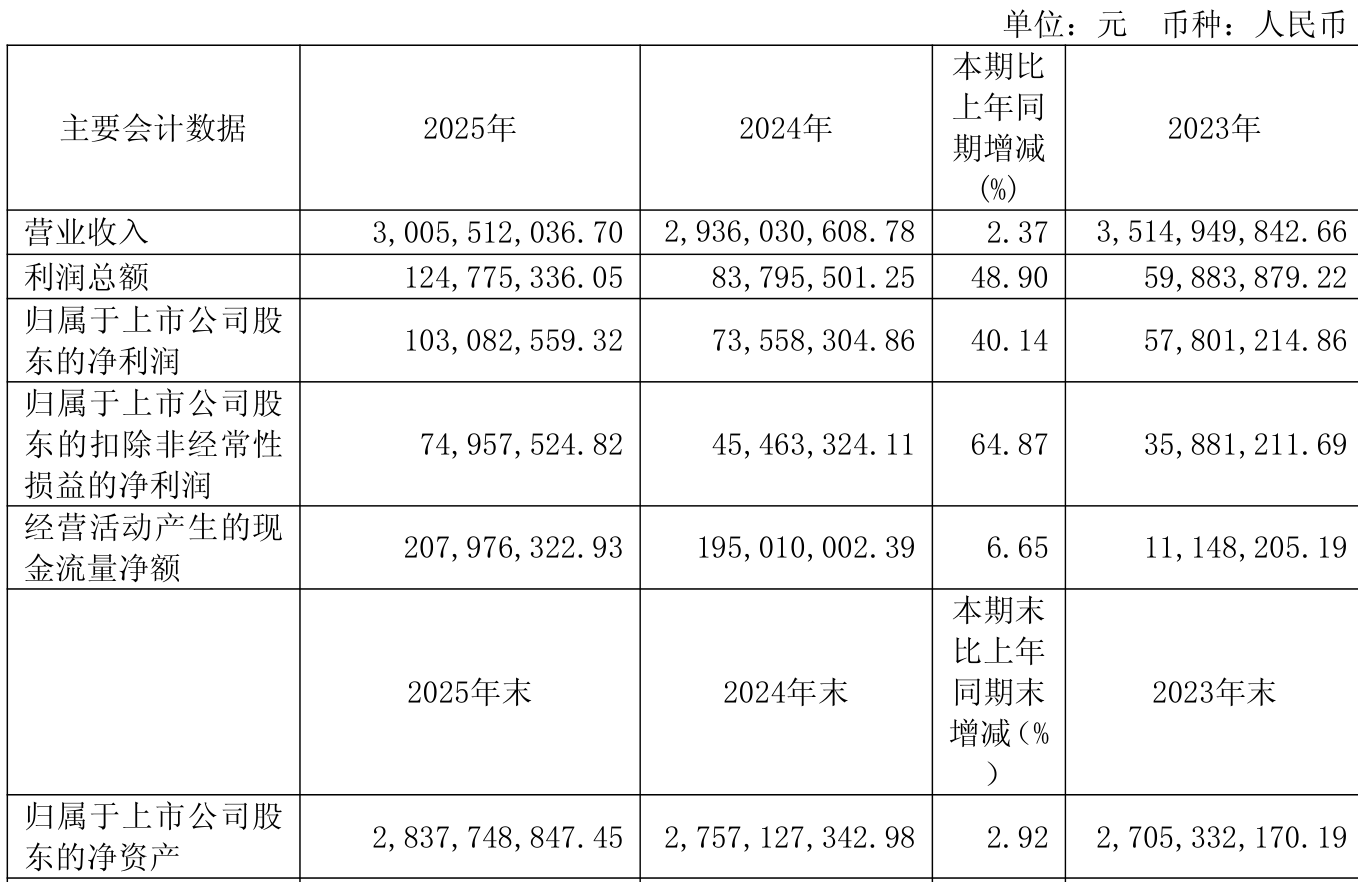 中证智能财讯森特股份(603098)4月20日披露2025年年度报告。2025年,公司实现营业总收入30.06亿元,同比增长2.37%;归母净利润1.03亿元,同比增长40.14%;扣非净利润7495.75万元,同比增长64.87%;经营活动产生的现金流量净额为2.08亿元,同比增长6.65%;报告期内,森特股份基本每股收益为0.19元,加权平均净资产收益率为3.68%。公司2025年度分配预案为:拟向全体股东每10股派现1元(含税)。