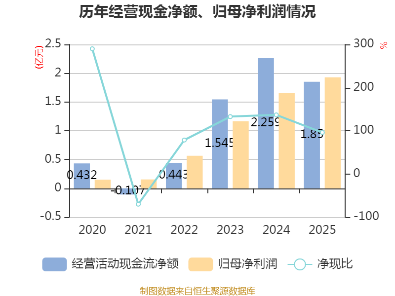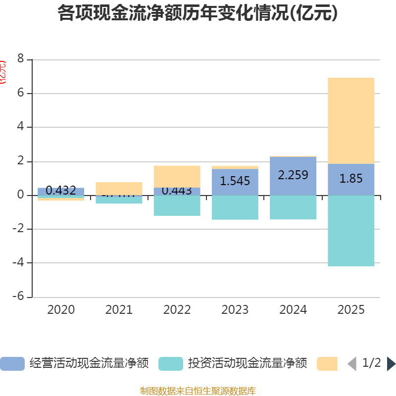 截至2025年,公司经营活动现金流净额为1.85亿元,同比下降18.1%;筹资活动现金流净额5.07亿元,同比增加5.01亿元;投资活动现金流净额-4.19亿元,上年同期为-1.43亿元。