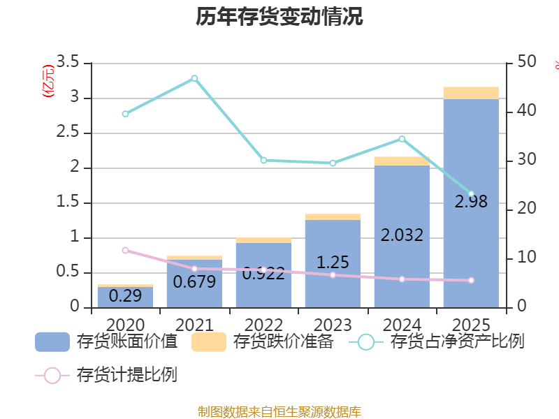 从存货变动来看,截至2025年末,公司存货账面价值为2.98亿元,占净资产的23.24%,较上年末增加9483.41万元。其中,存货跌价准备为1738.9万元,计提比例为5.51%。