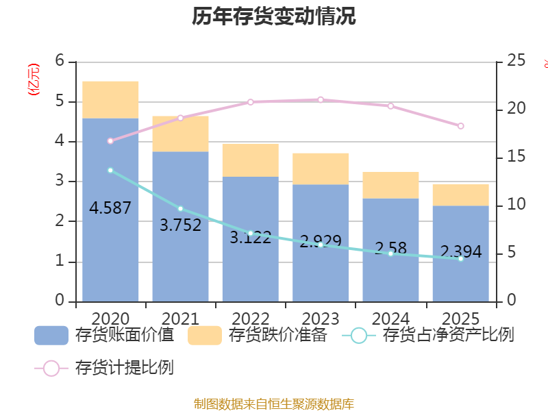 从存货变动来看,截至2025年末,公司存货账面价值为2.39亿元,占净资产的4.45%,较上年末减少1858.95万元。其中,存货跌价准备为5357.54万元,计提比例为18.29%。