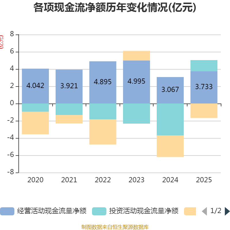 截至2025年,公司经营活动现金流净额为3.73亿元,同比增长21.74%;筹资活动现金流净额-1.68亿元,同比增加8148.12万元;投资活动现金流净额1.3亿元,上年同期为-3.71亿元。