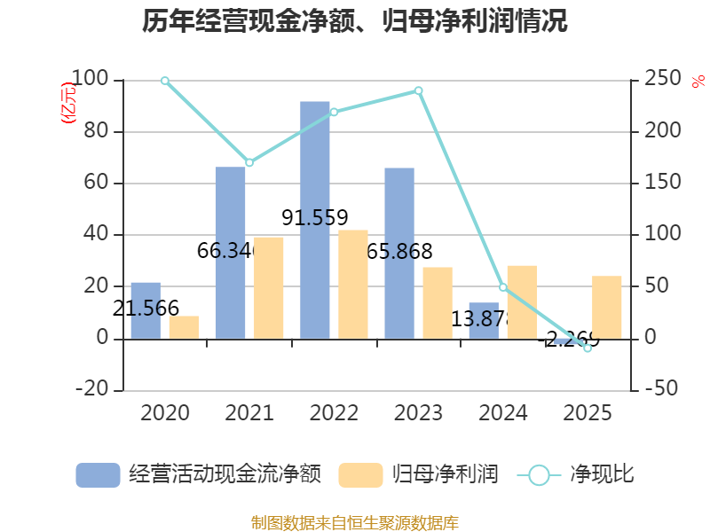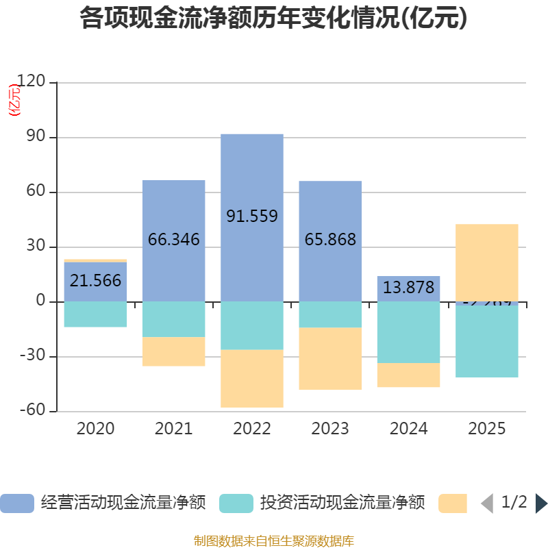 截至2025年,公司经营活动现金流净额为-2.27亿元,同比减少16.15亿元;筹资活动现金流净额42.26亿元,同比增加55.44亿元;投资活动现金流净额-39.33亿元,上年同期为-33.76亿元。