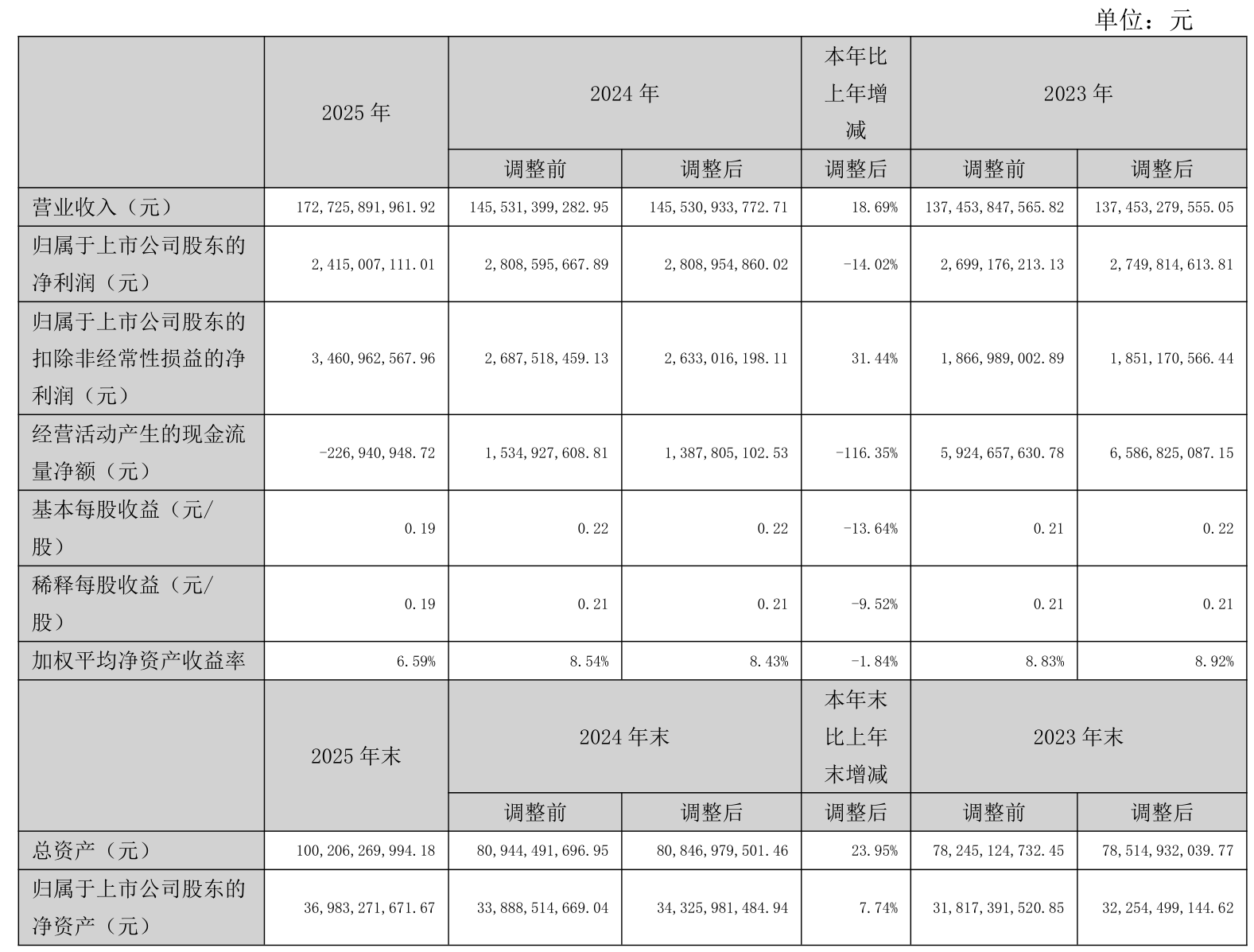 中证智能财讯铜陵有色(000630)4月20日披露2025年年度报告。2025年,公司实现营业总收入1728.25亿元,同比增长18.68%;归母净利润24.15亿元,同比下降14.02%;扣非净利润34.61亿元,同比增长31.44%;经营活动产生的现金流量净额为-2.27亿元,上年同期为13.88亿元;报告期内,铜陵有色基本每股收益为0.19元,加权平均净资产收益率为6.59%。公司2025年度分配预案为:拟向全体股东每10股派现0.5元(含税)。
