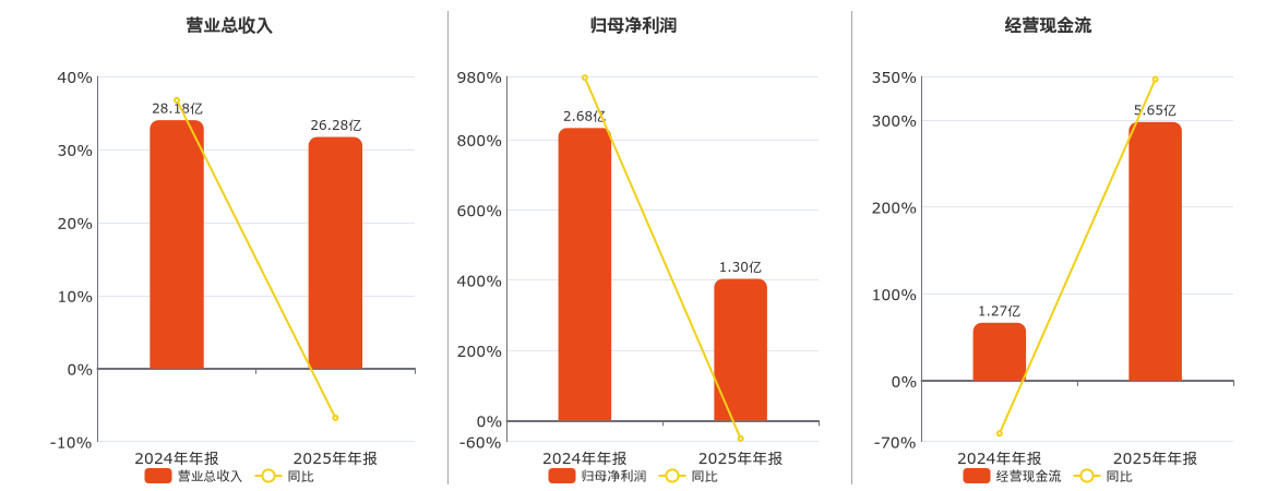公司营业总收入为26.28亿元,较去年同报告期营业总收入减少1.91亿元,同比较去年同期下降6.76%。归母净利润为1.30亿元,较去年同报告期归母净利润减少1.38亿元,同比较去年同期下降51.58%。经营活动现金净流入为5.65亿元。
