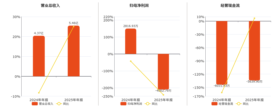 公司营业总收入为5.46亿元,在已披露的同业公司中排名第79。归母净利润为-4002.79万元,在已披露的同业公司中排名第78,较去年同报告期归母净利润减少6819.72万元,同比较去年同期下降242.10%。经营活动现金净流入为-5639.90万元,在已披露的同业公司中排名第82。