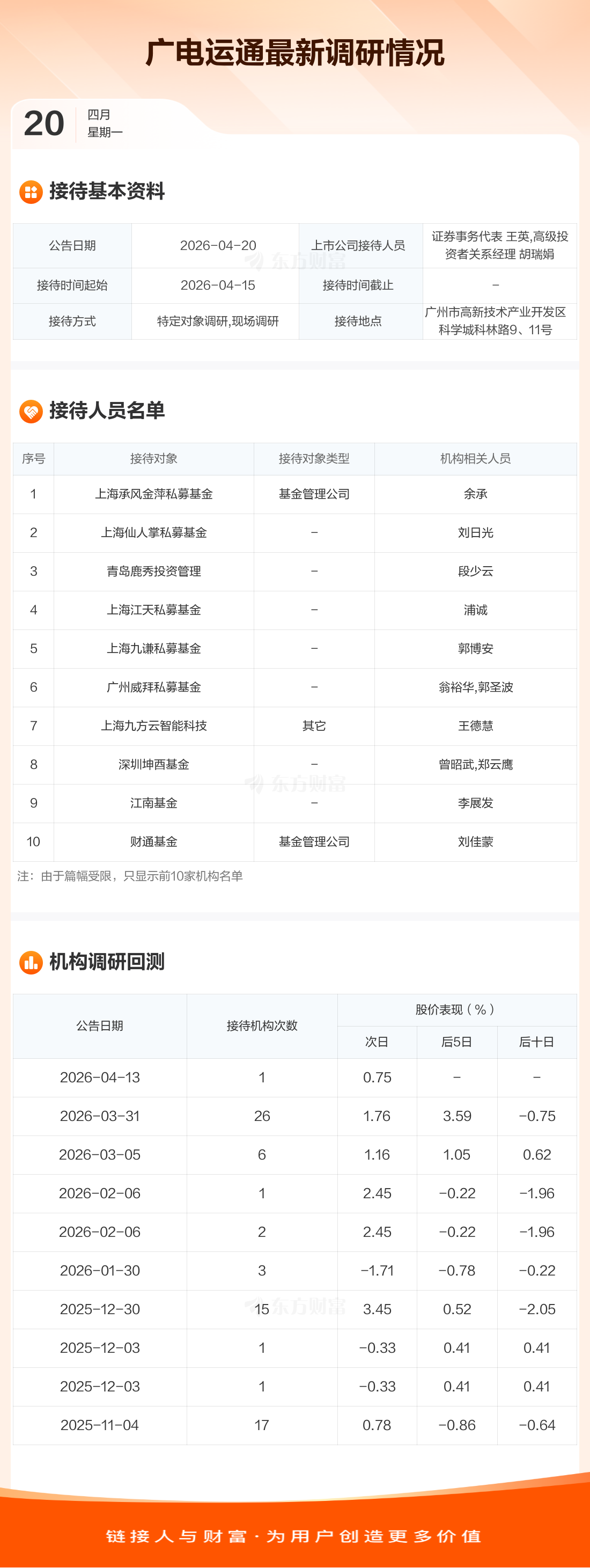 广电运通4月20日公告称,4月15日接待上海承风金萍私募基金等14家机构调研。接待人员包括证券事务代表 王英,高级投资者关系经理 胡瑞娟。