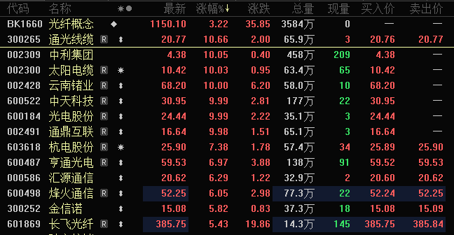 盘面上,光纤概念大幅拉升,中利集团、光电股份、中天科技、通鼎互联等涨停,亨通光电、杭电股份、长飞光纤等涨超5%。