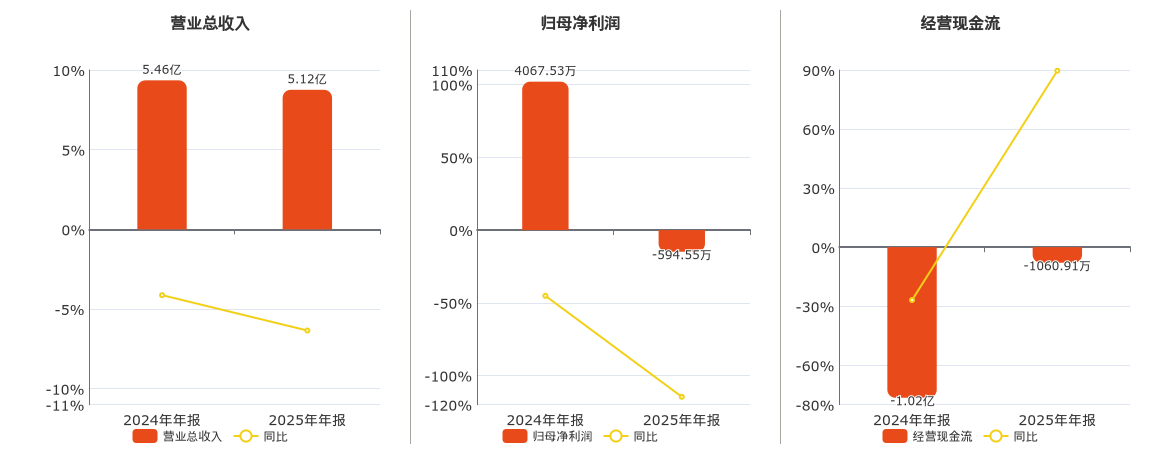 公司营业总收入为5.12亿元,较去年同报告期营业总收入减少3469.02万元,同比较去年同期下降6.35%。归母净利润为-594.55万元,较去年同报告期归母净利润减少4662.08万元,同比较去年同期下降114.62%。经营活动现金净流入为-1060.91万元。
