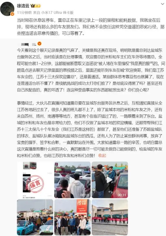 4月19日,小米集团董事长特别助理、战略市场部副总经理徐洁云回应网传“雷军被堵车里维权”:“当时刚在休息区停车,雷总正在车里记录上一段的里程和能耗数据,我就坐在后排,现场还有那么多的车友朋友们。我们绝不会放任这样凭空造谣的恶劣行径,那些捏造谣言恶意传播的,可以等着了。”
