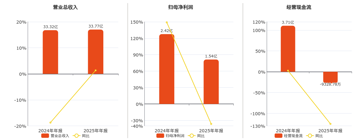 公司营业总收入为33.77亿元。归母净利润为1.54亿元,较去年同报告期归母净利润减少8798.31万元,同比较去年同期下降36.39%。经营活动现金净流入为-9328.78万元,较去年同报告期经营活动现金净流入减少4.65亿元,同比较去年同期下降125.12%。