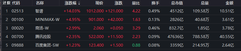 港股方面,智谱涨超14%,MINIMAX-W涨近5%,商汤、腾讯控股、百度集团等跟涨。