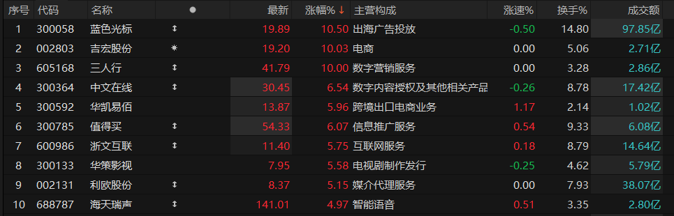 A股方面,蓝色光标涨超10%,吉宏股份、三人行涨停,中文在线、华凯易佰、值得买跟涨。