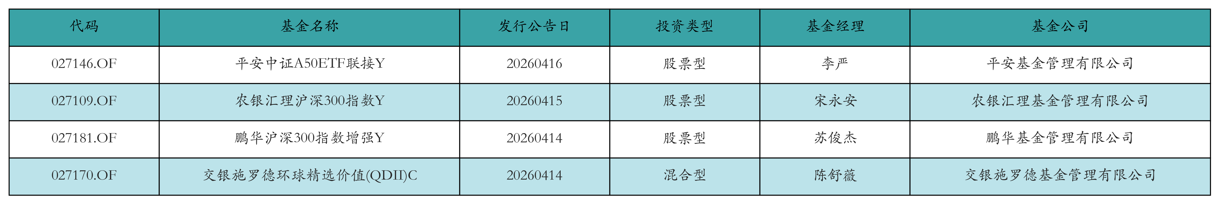 上周有4只新基金发行,分别为:平安中证A50ETF联接Y、农银汇理沪深300指数Y、鹏华沪深300指数增强Y、交银施罗德环球精选价值(QDII)C,详情见下表: