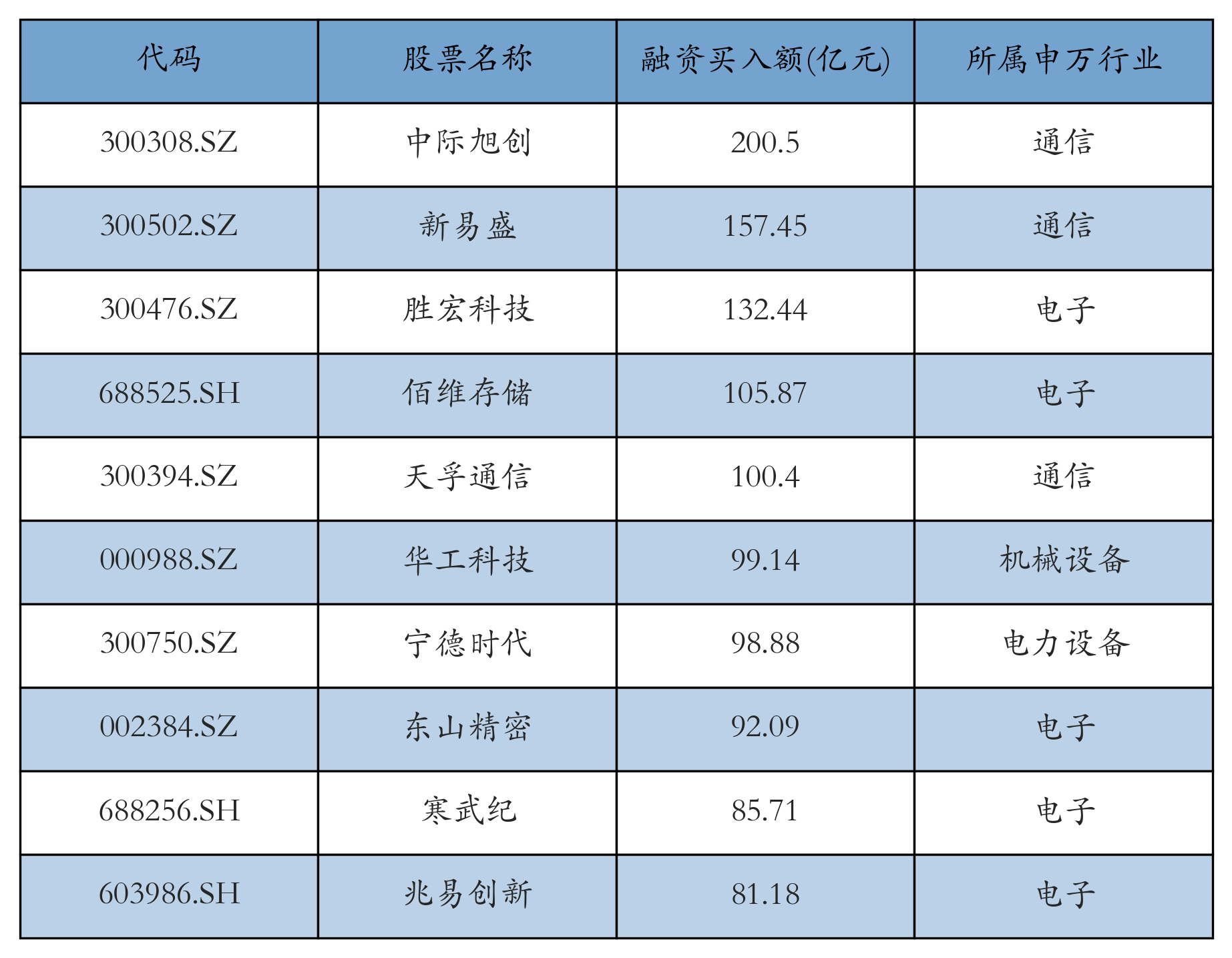 上周两市共有3494只个股有融资资金买入,共有218只个股买入金额超10亿元,其中中际旭创、新易盛、胜宏科技排名前三,买入金额分别200.5亿元、157.45亿元、132.44亿元。融资买入额前10个股详情见下表: