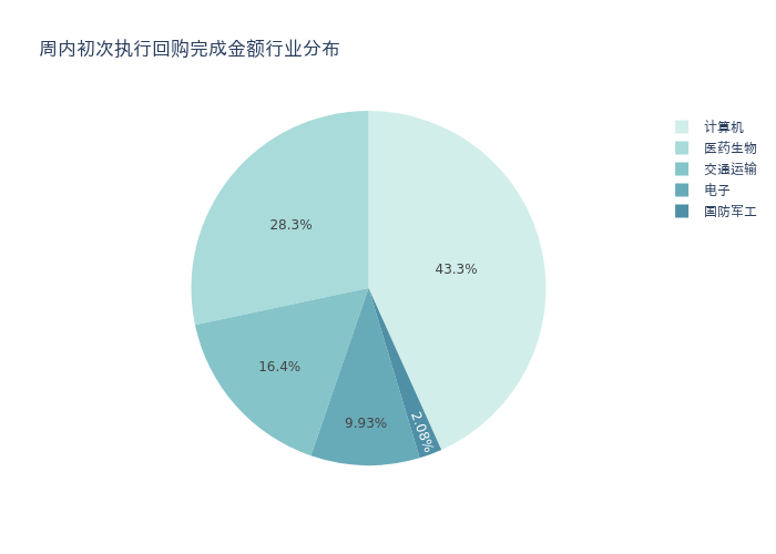 按照初次执行金额所在不同行业分布,金额最高的3个行业分别为:计算机、医药生物、交通运输,详情见下图: