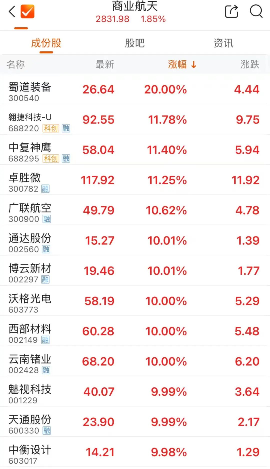 早盘,商业航天概念持续走高。蜀道装备“20cm”涨停,西部材料、中衡设计、魅视科技等多股涨停,中国卫星触及涨停,神剑股份一度冲高逼近涨停,广联航空、中复神鹰等涨幅靠前。