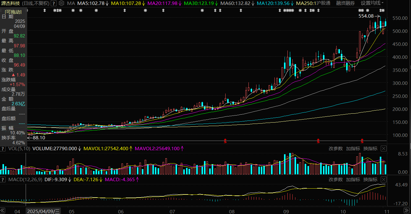 搭乘A股市场对AI算力赛道的极致追捧“东风”,源杰科技股价从2025年4月低点的88.1元,一路走高,一年累计涨幅超1540%。