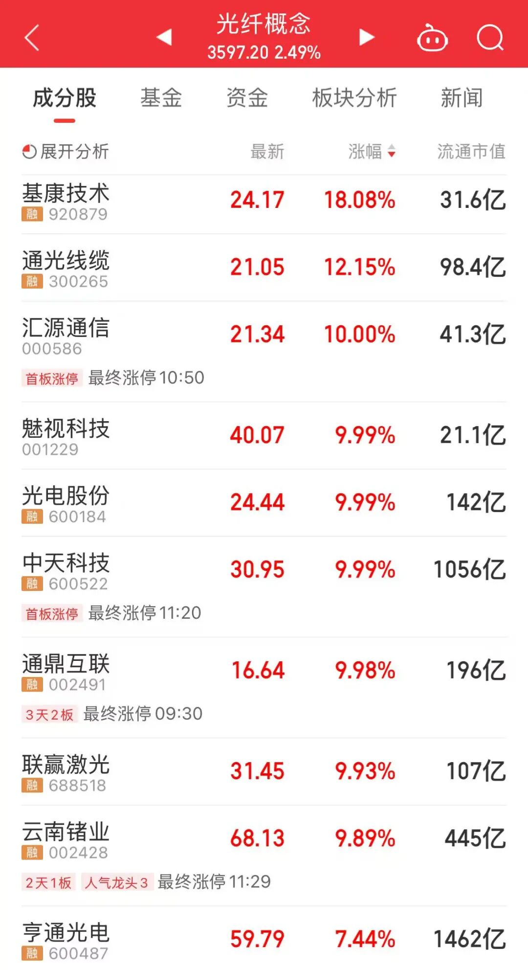 今天上午,算力产业链继续走强,光纤板块走势最强。中天科技、亨通光电、长飞光纤三大龙头股均大涨,其中,中天科技涨停。