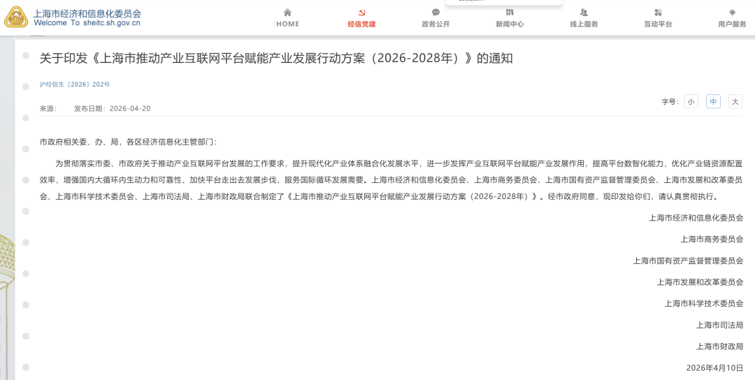 4月20日,上海市经济和信息化委员会官网显示,上海市经济和信息化委员会、上海市商务委员会等7部门印发《上海市推动产业互联网平台赋能产业发展行动方案(2026—2028年)》(以下简称《行动方案》)。