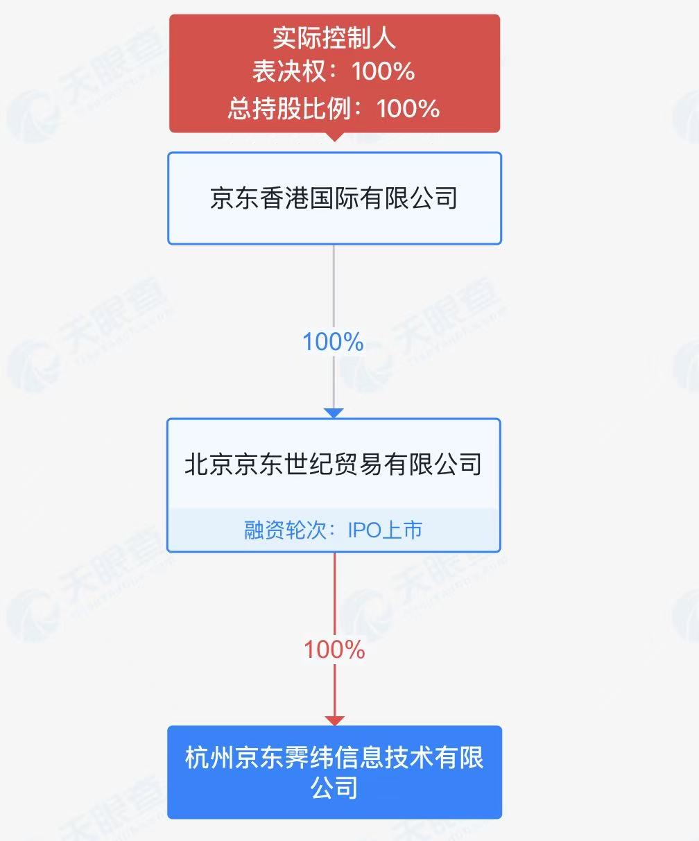 天眼查信息显示,北京京东世纪贸易有限公司持有杭州京东霁纬信息技术有限公司100%股权,而前者为京东香港国际有限公司全资子公司。