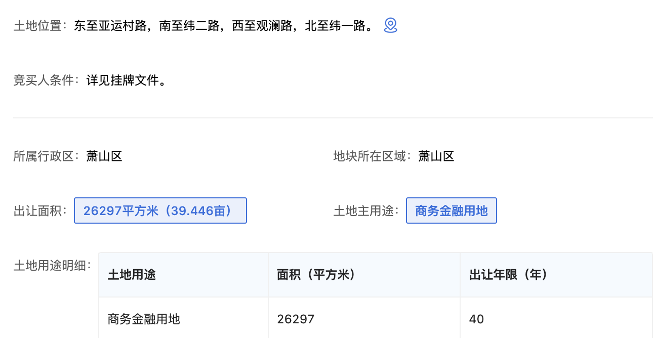 根据杭州市规划和自然资源局发布的出让公告,此次出让地块位于杭州市萧山区世纪城核心单元,区位优势显著。出让面积为26297平方米,规划用途为商业用地兼容商务金融用地,土地出让年限40年,竞买保证金13254万元,通过浙江省自然资源智慧交易服务平台完成线上挂牌交易。