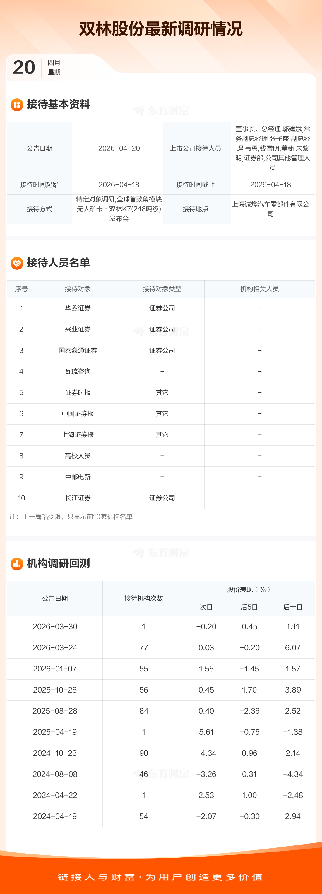 双林股份4月20日公告称,4月18日接待华鑫证券等16家机构调研。接待人员包括董事长、总经理 邬建斌,常务副总经理 张子盛,副总经理 韦勇,钱雪明,董秘 朱黎明,证券部,公司其他管理人员。