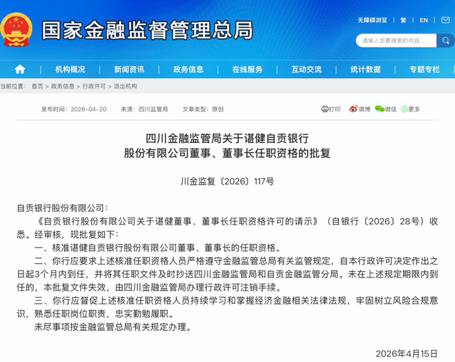 4月20日,据四川金融监管局官网披露的批复公告,该局核准了谌健自贡银行股份有限公司董事、董事长的任职资格。